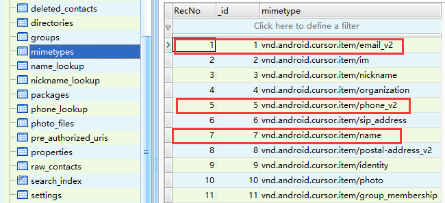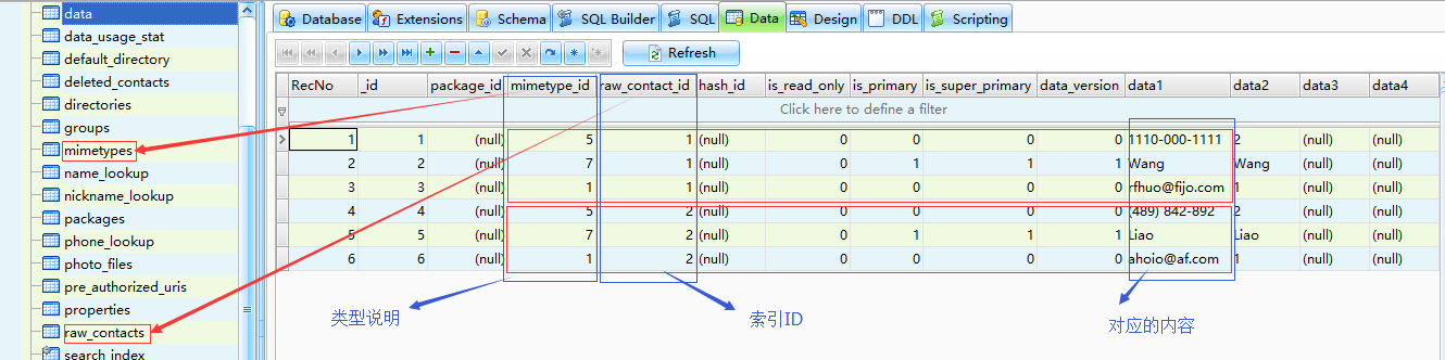 data表,这个表中的“data1”列几乎包含了我们想要的数据,但是如何通过分类提取,第四列的代号说明了data1数据的类型,这些代号在mimetypes表中有对应的说明,要找到这些数据,又要通过raw_contact_id去查找,这些ID又来于raw_contacts表中