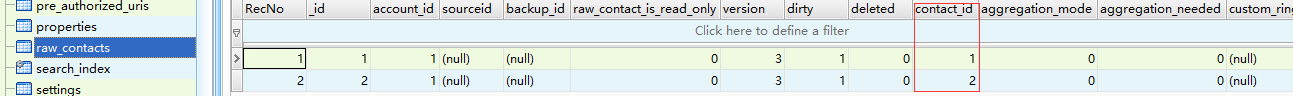 raw_contacts表,我们通信录中要显示的信息必须要在这里找到对应的ID,当我们删除了联系人,data表中的数据并没有删除,只是删除了证张表contact_id变为null,而不是真的删除