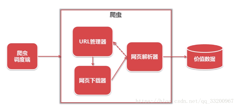 下图是爬虫的整体框架,其中包括调度端、URL管理器、网页下载器、网页解析器、价值数据,它们的作用如下: