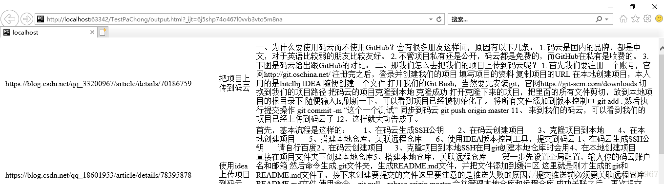 爬取完成之后,所有的数据都会以HTML格式存储在output.html中。可以在浏览器中打开,如: