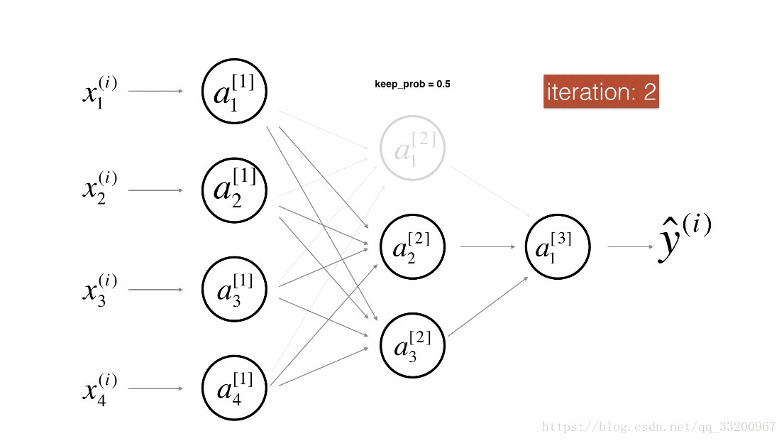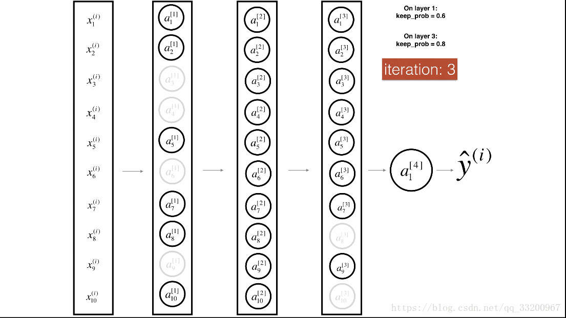 Dropout是一种广泛使用的专门针对深度学习的正规化技术。 它在每次迭代中随机关闭一些神经元。具体流程如下:
