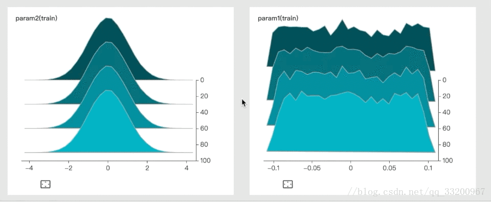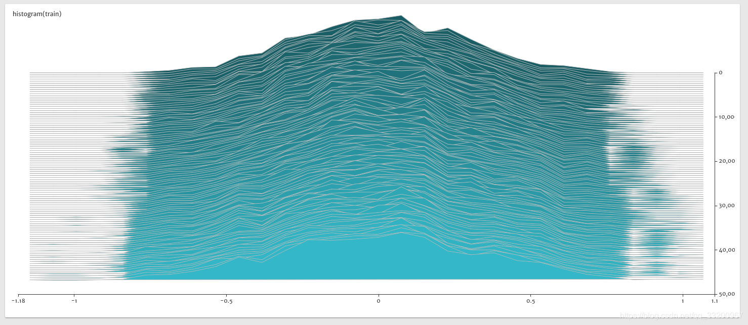 下图是训练是参数的histogram图,从图中可以看出参数正在趋于稳定,同时的没有出现异常值,如极大值或者极小值。