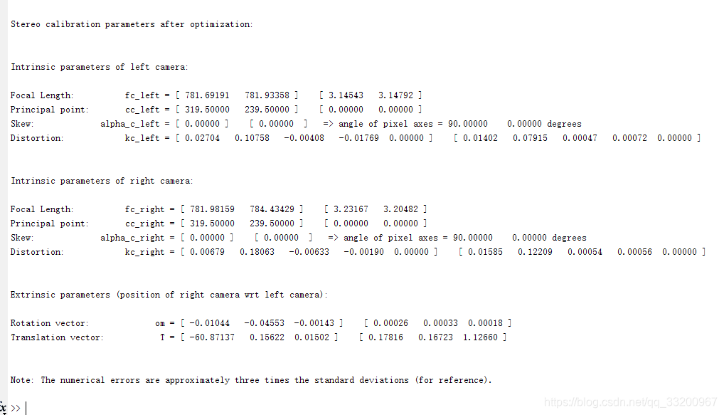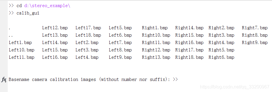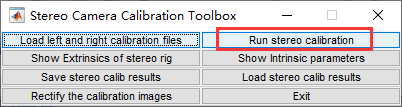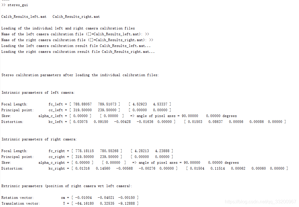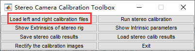 上面都完成之后,应该有Calib_Results_left.matCalib_Results_right.mat这两个文件。然后在命令区输入命令:stereo_gui,会弹出以下界面,点击Load left and right calibration files按钮。