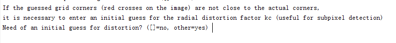 如果是无畸变的摄像头,在命令去看到以下输出时,直接回车就可以开始标注下一张图像了。如果是有畸变的摄像头,需要输入1,然后根据提示输入调整参数,参数范围在[-1, 1],通过调整使得红色的标记都在每个格子的对角上。