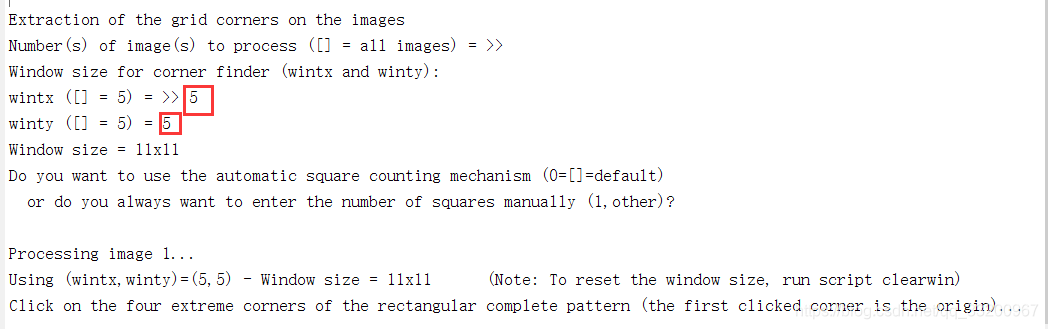 回到命令区,标定第一张图像时,需要输入棋盘中每个格子的大小,笔者使用A3纸打印的,每个格子大概是28.8mm,这个需要读者去测量自己其他每个格子的大小。