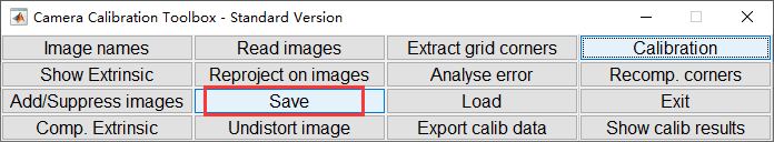 最后点击保存标注信息,文件会被保存为Calib_Results.mat,我们需要将标定结果文件重命名为: Calib_Results_left.mat,这是为了修改成下一步默认路径。左目摄像头标定完成后,按照同样的方法标定右目摄像头,将标定结果文件重命名为:Calib_Results_right.mat,之后可以进行双目标定。