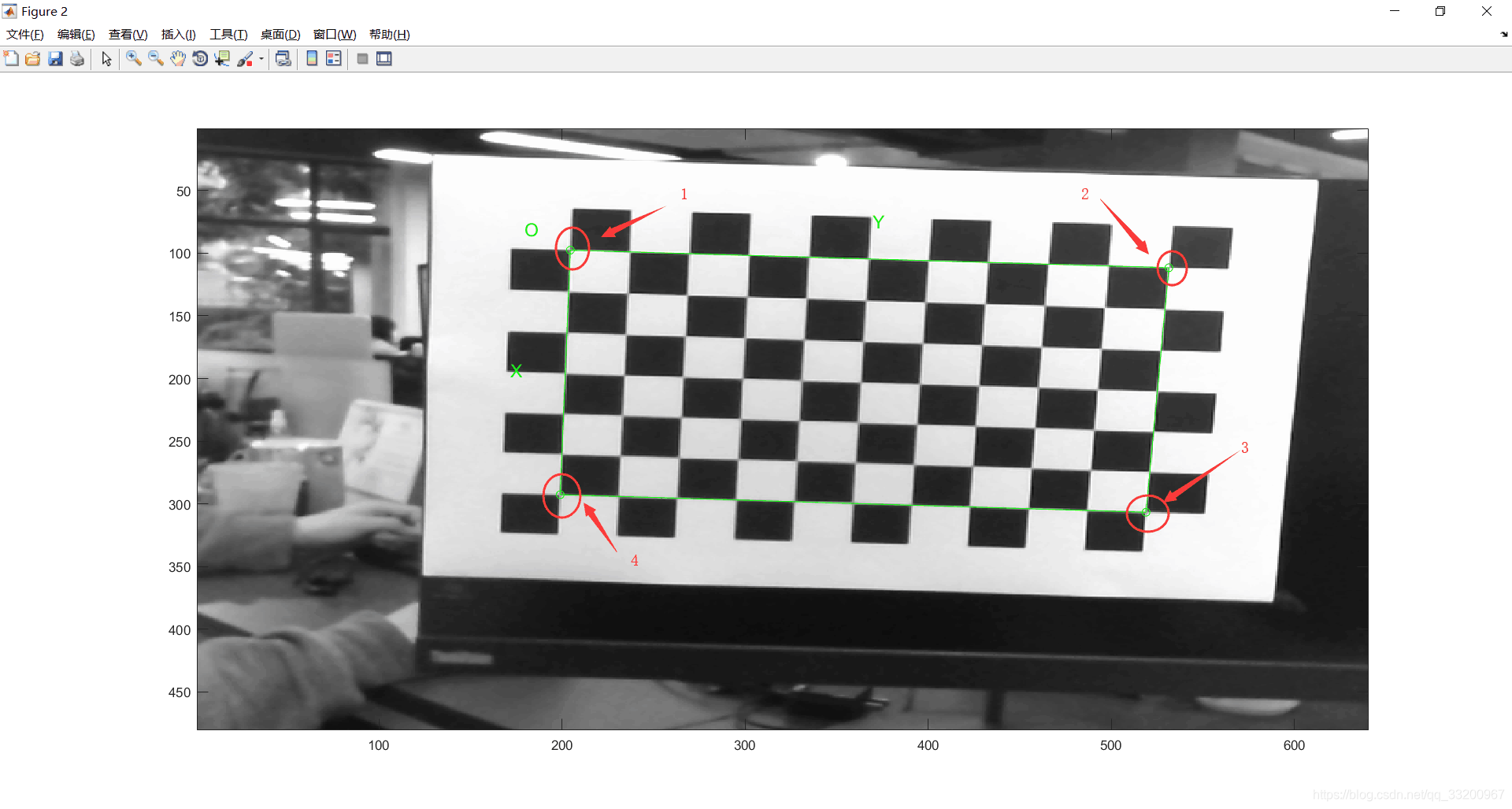 执行完上面之后,会弹出一个标定图像的窗口,标定时需要按照左上、右上、右下、左下顺序点击 4 个边界角点,如图所示。