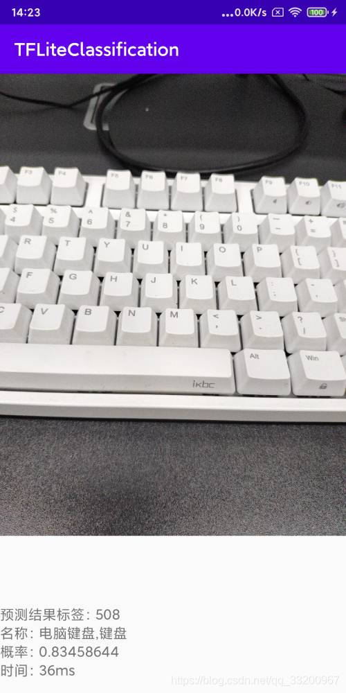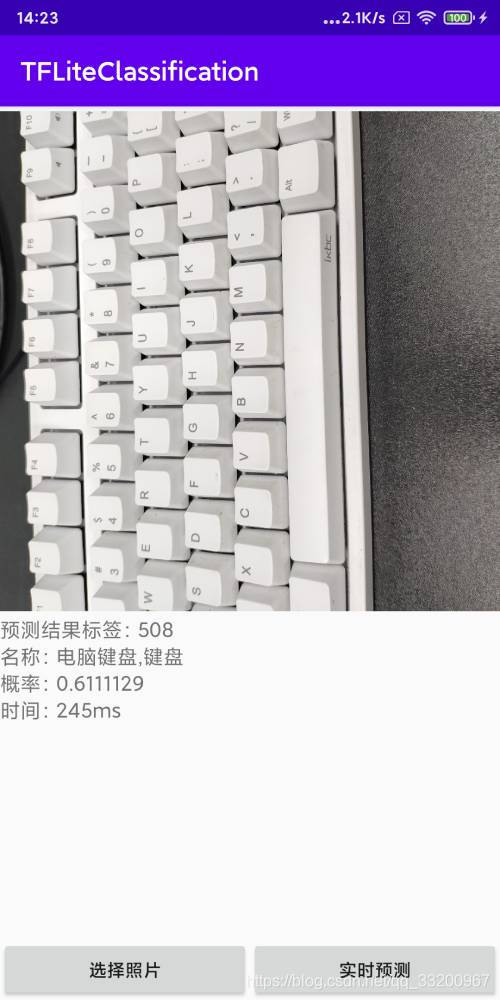 当打开相册选择照片之后,回到原来的页面,在下面这个回调方法中获取选择图片的Uri,通过Uri可以获取到图片的绝对路径。如果Android8以上的设备获取不到图片,需要在AndroidManifest.xml配置文件中的application添加android:requestLegacyExternalStorage="true"。拿到图片路径之后,调用TFLiteClassificationUtil类中的predictImage()方法预测并获取预测值,在页面上显示预测的标签、对应标签的名称、概率值和预测时间。