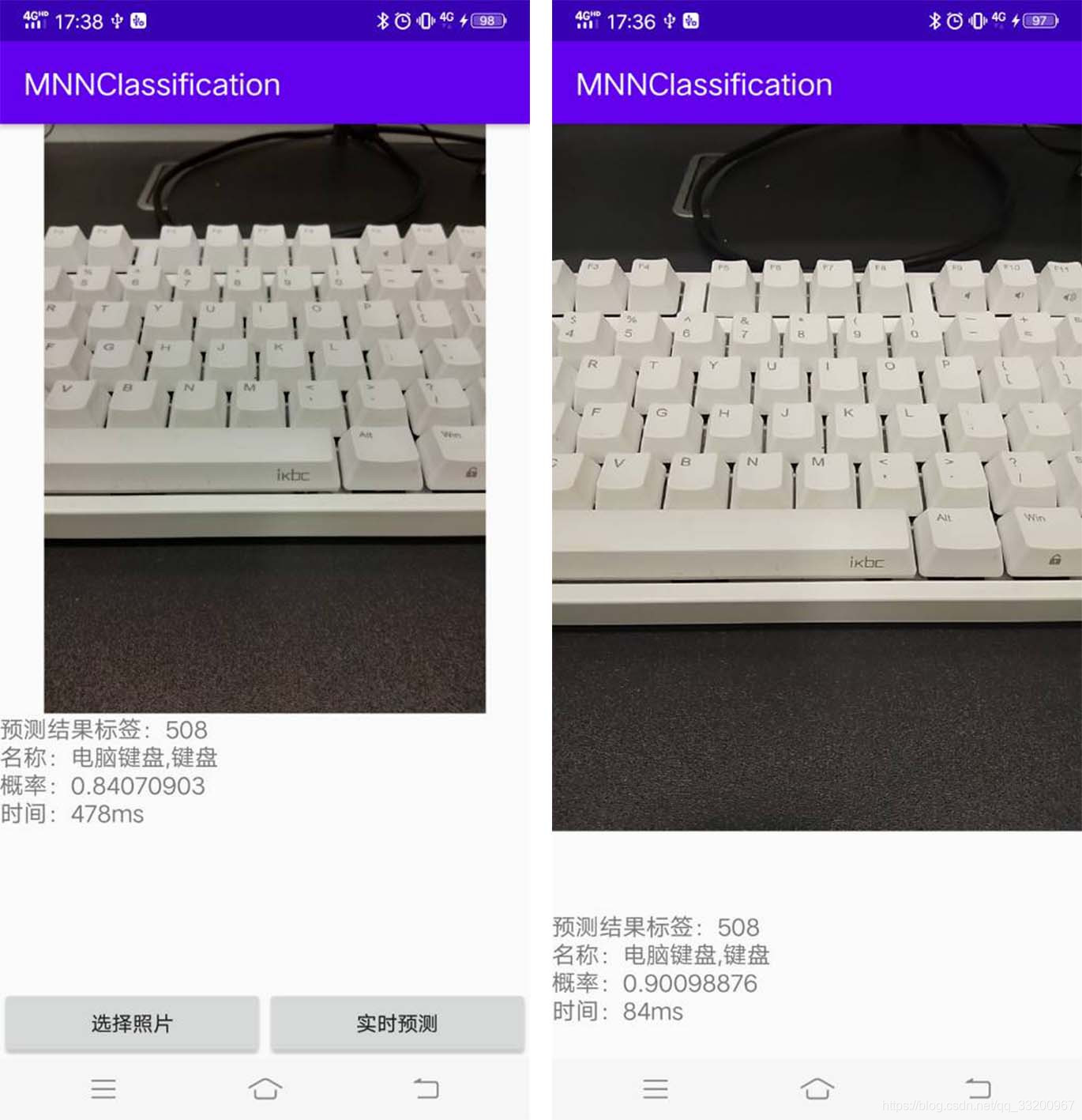 添加两个按钮点击事件,可以选择打开相册读取图片进行预测,或者打开另一个Activity进行调用摄像头实时识别。